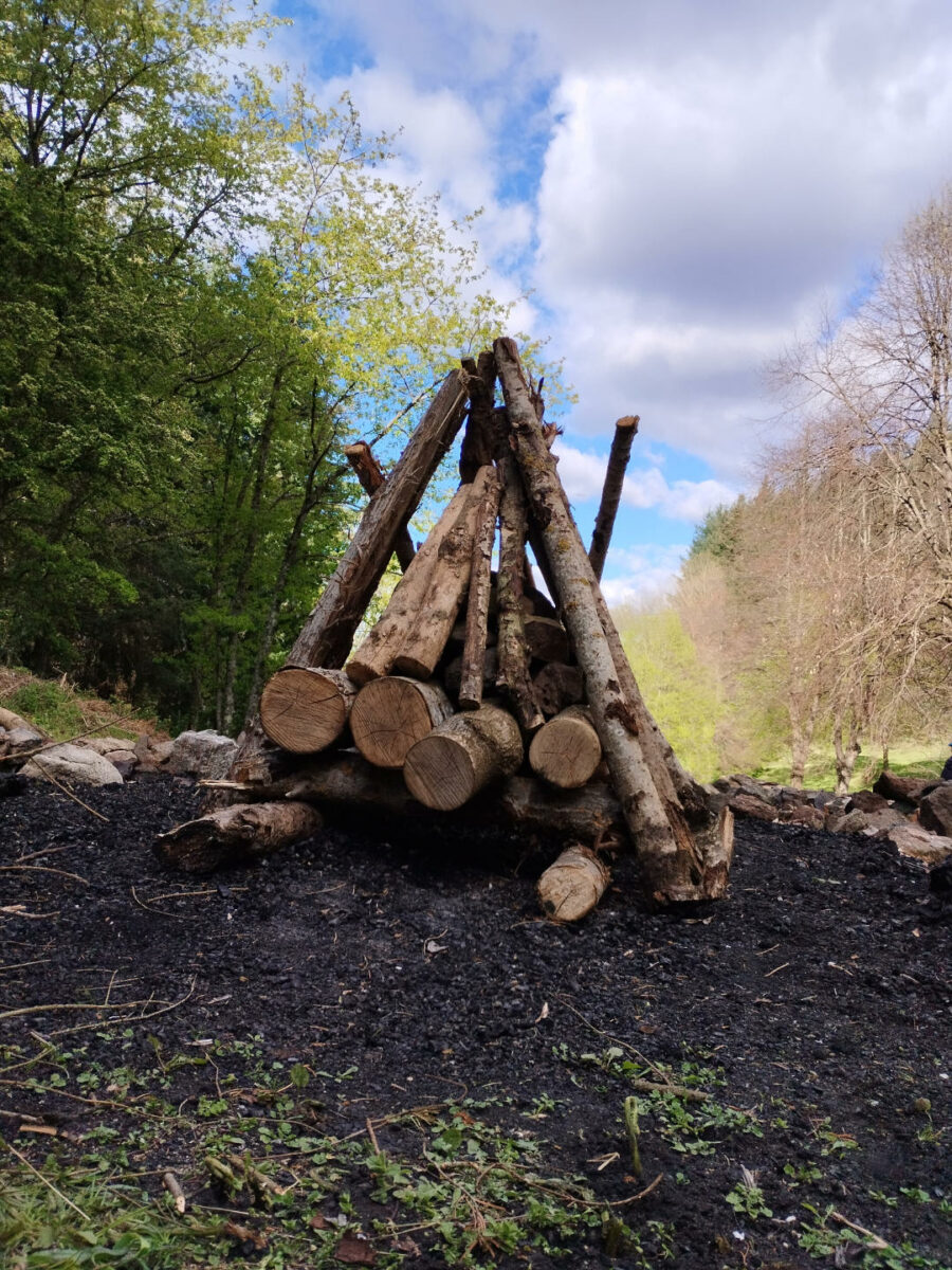 Retour sur le lieu de la hutte. Elle n’a pas bougé depuis la retraite de cet hiver. En une demi-journée, elle est prête. Le feu est préparé lui aussi. Le lieu est prêt, maintenant, c’est à nous de nous préparer.
